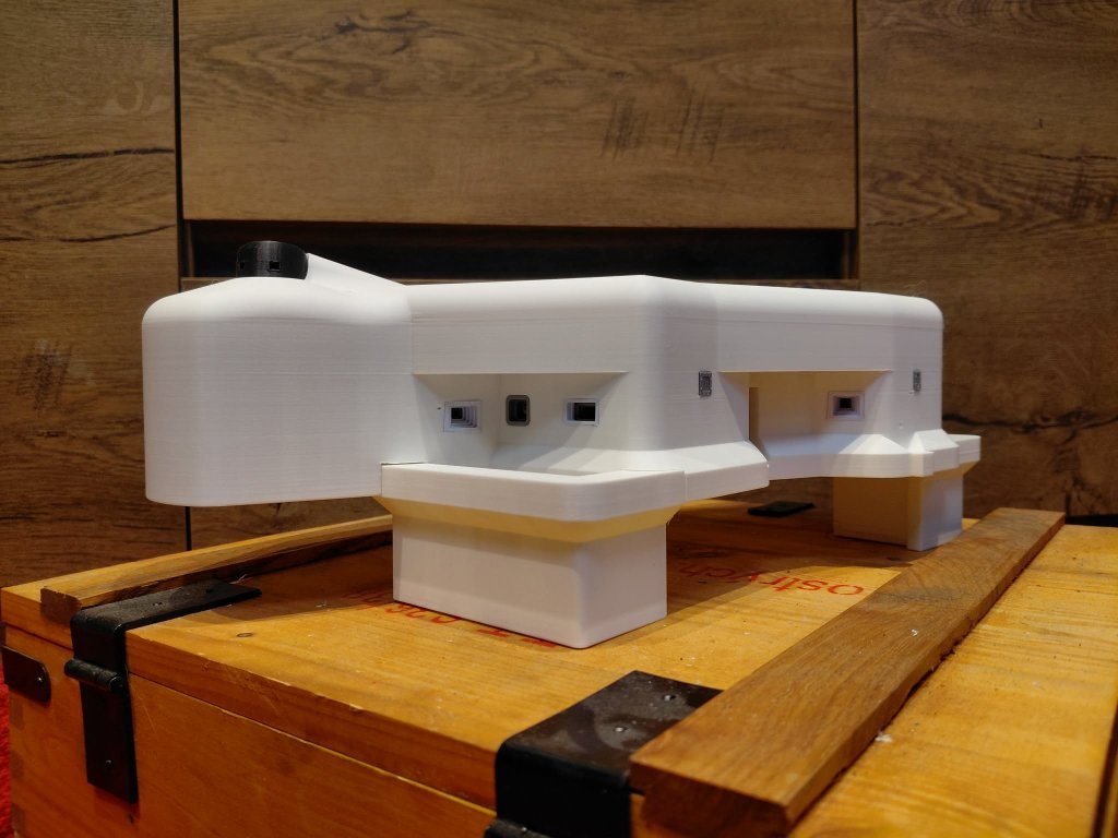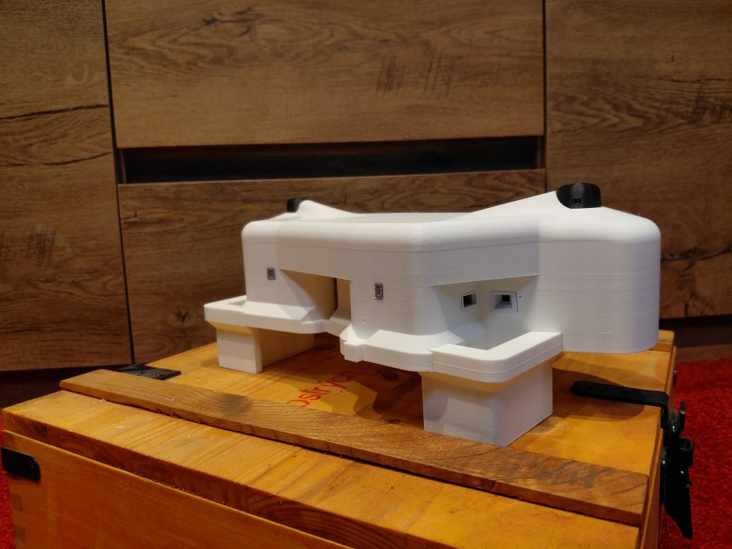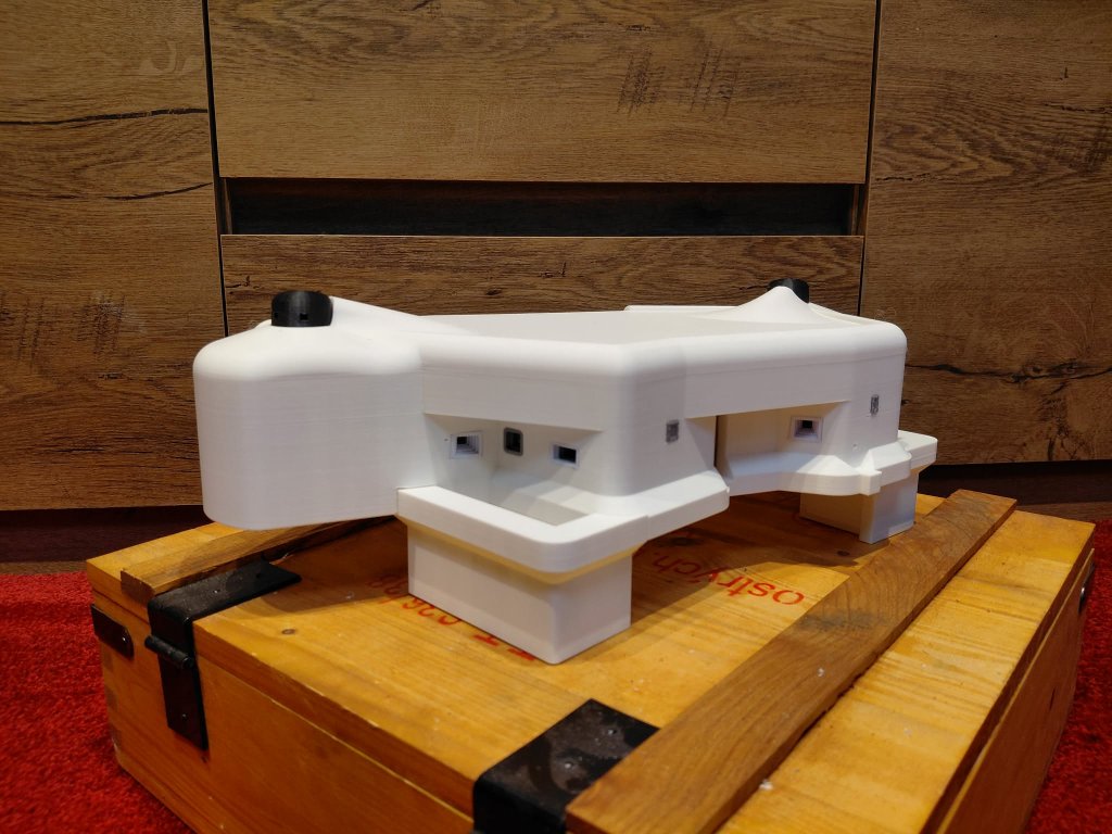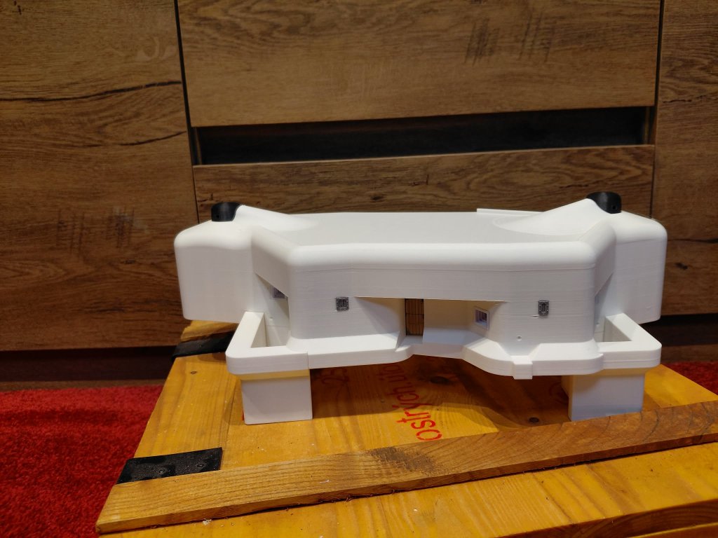 Jednodílný skelet objektu (stropnice a patro v jenom kuse) , 2x dva díly diamantového příkopu, jeden díl vstupní chodbičky.